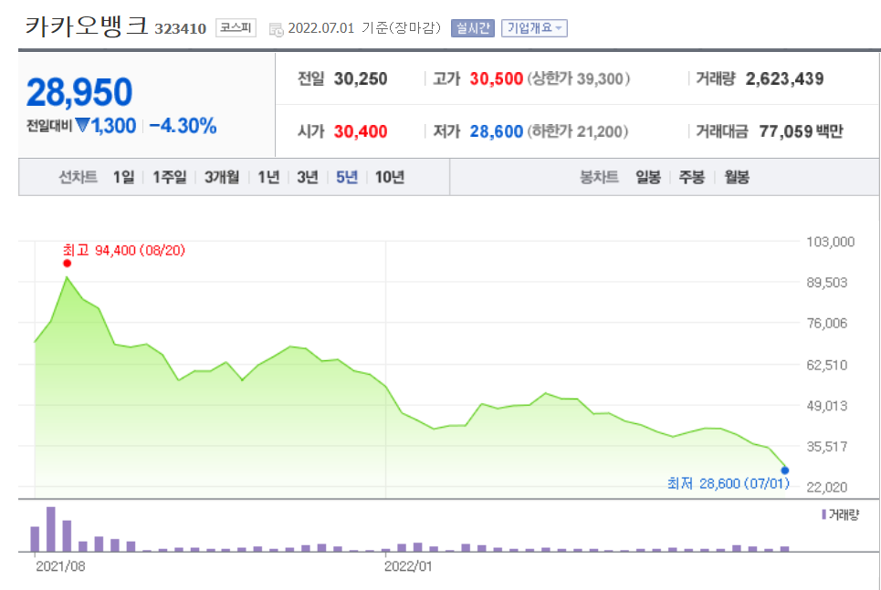 한때 90,000원을 넘겨 KB금융지주, 신한금융지주를 넘기고 국내 은행 대장주로 타이틀을 거머쥐었던 카카오뱅크의 주가는 속절 없이 추락해 '22년 7월 30,000원 선을 깨고 내려갔다.