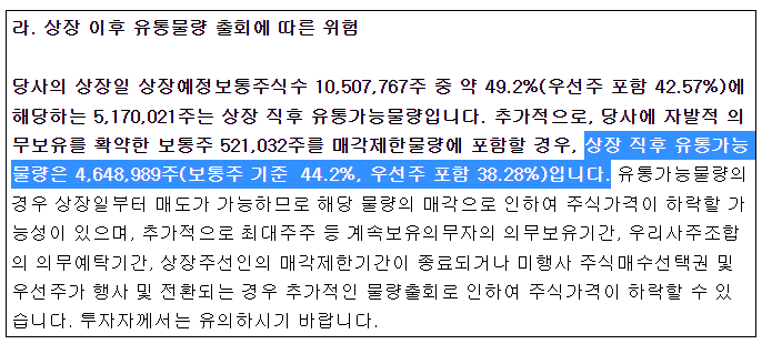 상장 직후 전체 발행주식 수 기준 약 40%의 물량이 즉시 매도 가능했다는 점도 큰 부담으로 작용했다.