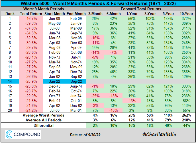 18 Oct 2022 by Charlie Bilello Notes: -I have a new channel on YouTube where I share my latest thoughts on markets and investing. You can view the most recent video here. -If you missed my recent webinar with YCharts, click here to view the replay. __ T
