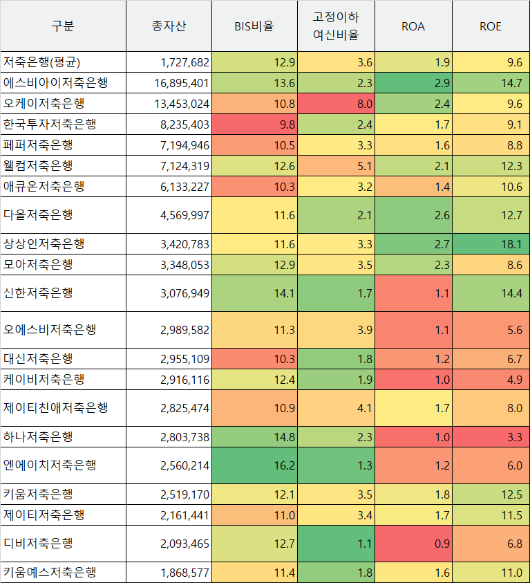 건전성 지표인 BIS비율/고정이하여신비율 모두에서 저축은행 중 하위권(빨간 음영)에 속했다.
