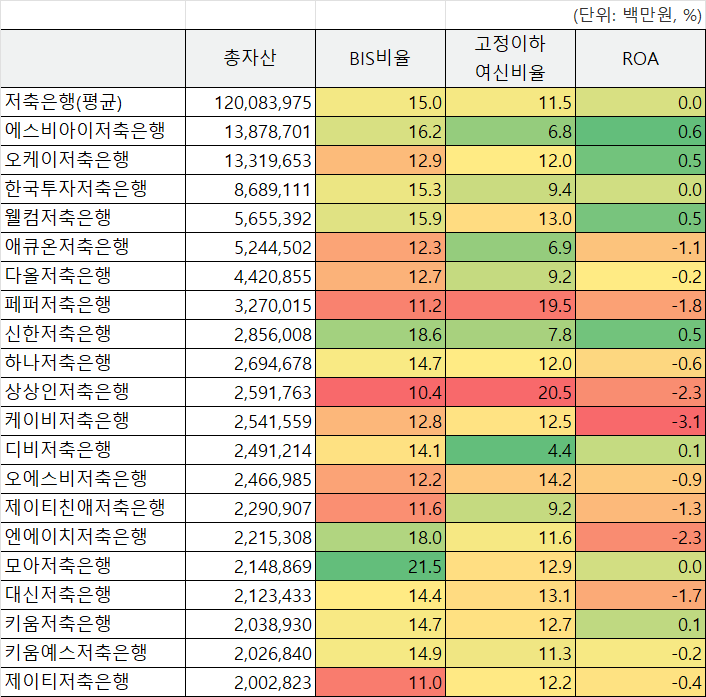 이슈가 생긴다하더라도 예금자보호법으로 인해 금융기관별로 5천만원까지는 보호가 되기에 예금 등에 손실이 발생할 가능성은 높지 않다고 생각한다. 그래도 혹시 내가 예치한 저축은행의 영업상황이 급격히 악화된다거나 하여 불안에 떨면 안되니 주기적으로 저축은행이 건전한지 확인해줄 필요가 있다.