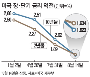 8월 14일 미국 채권시장에서 10년 만기 국고금리와 2년 만기 국고금리가 같아지자, 주가가 3% 이상 폭락했...
