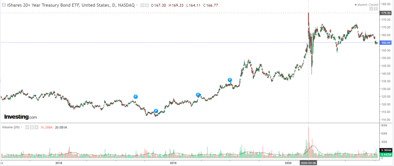 한편 채권의 경우 보통 주식과 반대로 움직이는 성격을 가지고 있다고는 하나 아래 TLT(미국 20년 국채 ETF) 차트에서 볼 수 있듯 이미 역사적인 고점 수준(제로금리 때문에)에 와있기 때문에 지금과 같이 주가가 많이 상승해 그만큼 하락할 수 있는 폭이 커져있는 상황에서 충분한 방어책이 될 수 없다고 본다.
